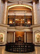 The main Rotunda is located on the second floor with walls of Italian white marble trimmed with Belgian black marble, cast iron balustrades with architectural motifs encircling the space, and the central dome rising above allowing in natural light to mix with the original electric light fixtures. A relief sculpture of Lady Justice is seen above each of the top arches.