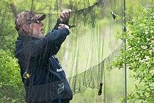 Mist nets were used by Japanese hunters for nearly 300 years for capturing birds. They were first introduced into use for ornithology in the United States of America by Oliver L. Austin in 1947.[2] Mist netting is a popular and important tool for monitoring species diversity, relative abundance, population size, and demography. There are two ways in which mist nets are primarily utilized: target netting of specific species or individuals, and broadcast netting of all birds within a particular area. Targeted netting is typically used for scientific studies that examine a single species. Nets deployed in this manner often use a playback of a species' song or call, or a model of that species placed near the net to lure the targeted individuals into the net (e.g.[3] ).