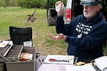 Humans who deal with the species caught in mist nets are called banders in the United States. Banders are responsible for banding the species caught in the net so they can be tracked. In the United States, in order to band a bird or bat, one must have a banding permit. Banding permits are given to people who have gone through training and whose projects contribute to the conservation and management of the bird population. Banders are responsible for the animals caught and thus apply their training by paying attention to stress cues (for birds these include panting, tiredness, closing of eyes, and raising of feathers). If not, the animal can severely injure itself. There are different types of banding permits for birds, the Master Permit and the Sub permit. Master Permits are given to individuals who band on their own or who supervise banding operations. Sub permits are given to individuals who will be supervised while banding by a person with a Master Permit. In order to receive a permit, one must fill out an application and return it to the nearest banding office. Banders must ask for special authorization in their application in order to use mist nets, cannon nets, chemicals, or auxiliary markers.[8]