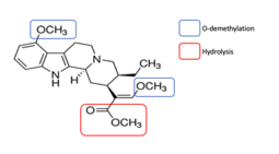 During phase I metabolism, mitragynine undergoes hydrolysis of the methylester group on C16 as well as o-demethylation of both methoxy groups on positions 9 and 17.[23][2] Following this step, oxidation and reduction reactions convert aldehyde intermediates into alcohols and carboxylic acids.[2] P450 metabolic enzymes are known to facilitate the phase I metabolism of mitragynine which reportedly has an inhibitory effect on multiple P450 enzymes, raising the possibility of adverse drug interactions.[24][2][21]