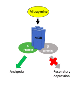 Mitragynine acts on a variety of receptors in the CNS, most notably the mu, delta, and kappa opioid receptors.[21] The nature of mitragynines' interaction with opioid receptors has yet to be fully classified with some reports suggesting partial agonist activity at the mu opioid receptor[4][21][22] and others suggesting full agonist activity.[3] Additionally, mitragynine is known to interact with delta and kappa opioid receptors as well, but these interactions remain ambiguous with some reports indicated mitragynine as a delta and kappa competitive antagonist[21] and others as a full agonist of these receptors.[3] In either case, mitragynine is reported to have lower affinity to delta and kappa receptors compared to mu receptors.[2] Mitragynine is also known to interact with dopamine D2, adenosine, serotonin, and alpha-2 adrenergic receptors, though the significance of these interactions is not fully understood.[21][3] Additionally, several reports of mitragynine pharmacology indicate potential biased agonism activity favoring G protein signaling pathways independent of beta - arrestin recruitment,[21][6][4][22] a primary component in opioid induced respiratory depression.[21]