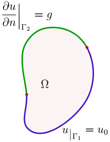 For example, given a solution u to a partial differential equation on a domain Ω with boundary ∂Ω, it is said to satisfy a mixed boundary condition if, consisting ∂Ω of two disjoint parts, Γ