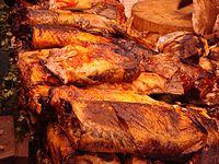 A mixiote is a traditional pit-barbecued meat dish in central Mexico; especially in the Basin of Mexico. It can also be prepared in an oven. It is usually made with mutton or rabbit, but chicken, lamb, and pork are also used. The meat is cubed with the bone and seasoned with pasilla and guajillo chili peppers, cumin, thyme, marjoram, bay leaves, cloves and garlic. It is then wrapped in small packages made of the tough semi-transparent outer skin of the leaves of the maguey or century plant, which gives it a unique flavor.[1] Diced nopales are often included with the meat before wrapping.