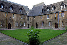 Mob Quad is a four-sided group of buildings from the 13th and 14th centuries in Merton College, Oxford, surrounding a small lawn. It is often claimed to be the oldest quadrangle in Oxford and elsewhere,[1] although Merton's own Front Quad was actually enclosed earlier (albeit with a less unified design)[2] and Corpus Christi College, Cambridge, says that its own Old Court is the oldest structure of its type in either Oxford or Cambridge. The quadrangle pattern has since been copied at many other colleges and universities worldwide.