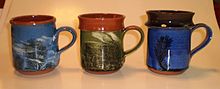 Mocha decorated pottery is a type of dipped ware (slip-decorated, lathe-turned, utilitarian earthenware), mocha or mochaware, in addition to colored slip bands on white and buff-colored bodies, is adorned with dendritic (tree-like or branching) markings resembling the natural geological markings on moss agate, known as "mocha stone" in Great Britain in the late 18th century. The stone was imported from Arabia through the port of Mocha (al Mukha in Yemen) from whence came large supplies of coffee. An unknown potter or turner discovered that by dripping a colored acidic solution into wet alkaline slip on a pot body, the color would instantly ramify into the dendritic random markings that fit into the tradition of imitating geological surfaces prevalent in the potteries of that period. The earliest known dated example (1799) is a mug in the collection of the Christchurch Mansion Museum in Ipswich, England. Archaeological excavations of the wreck of HMS Nymphe in Road Town Harbor on Tortuga in the British West Indies produced sherds of two earthenware vessels with dendritic markings on slip marbled surfaces. The sloop was accidentally burned and sunk in 1783, giving an earlier date for this technique provided the sherds are from that wreck. The context appears to support that supposition. Archival references are known that mention "mocoe beakers" as early as 1792.