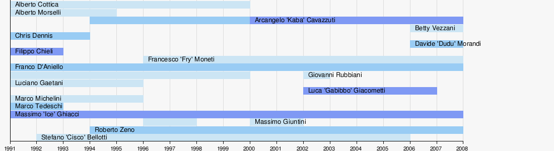 The band's lineup has changed many times since their formation.[4] After the first album, singer Alberto Morselli left the band; in 1996 Francesco Moneti replaced Marco Michelini, and Giovanni Rubbiani and Alberto Cottica left the band in 2001. Singer Stefano "Cisco" Bellotti left the band in 2005 after fourteen years. The lineup in 2006 was: