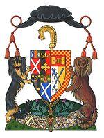 The Moderator of the General Assembly of the Church of Scotland has an official coat of arms awarded by the Lord Lyon King of Arms. It includes a shield showing the burning bush, plus the Quigrich - the crozier of St Fillan - behind the shield (with the curved head of the Quigrich visible above the shield). The shield is surmounted by a black Geneva bonnet - closely associated with John Knox. Similar to the coat of arms of an archbishop, there are the addition of twenty blue tassels arranged with ten on each side.