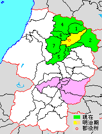 With the establishment of the municipality system on April 1, 1889, one towns (Shinjo) and 15 villages were established. Kaneyama was raised to town status on January 1, 1925 and Shinjō was raised to city status on April 1, 1949. Mamurogawa was raised to town status on April 1, 1950 and the towns of Mogami and Funagata were created on September 1 and December 1, 1954.