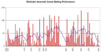 Mohinder Amarnath played 69 Tests scoring 4,378 runs at a batting average of 42.50, with 11 hundreds and 24 fifties, and claimed 32 wickets at a bowling average of 55.68 apiece. In 85 One Day Internationals, he scored 1,924 runs at an average of 30.53 and a highest score of 102 n.o. and claimed 46 wickets at 42.84 apiece.[6]