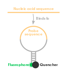 Molecular beacons, or molecular beacon probes, are oligonucleotide hybridization probes that can report the presence of specific nucleic acids in homogenous solutions. Molecular beacons are hairpin-shaped molecules with an internally quenched fluorophore whose fluorescence is restored when they bind to a target nucleic acid sequence. This is a novel non-radioactive method for detecting specific sequences of nucleic acids. They are useful in situations where it is either not possible or desirable to isolate the probe-target hybrids from an excess of the hybridization probes.