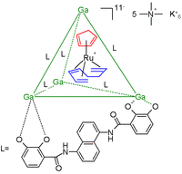 In another example[2] the cage consists of a gallium tetrahedral cluster compound stabilized by 6 bidentate catechol amide ligands residing at the tetrahedron edges. The guest is a 16 electron and thus very reactive ruthenium metallocene (an organometallic catalyst) with a cyclopentadienyl ligand (red) and a 1,3,7-octatriene ligand (blue). The total charge for this anion is 11 and the counterions are 5 tetramethyl ammonium cations and 6 potassium cations. The ruthenium compound decomposes in water within minutes but encapsulated it survives in water for weeks.