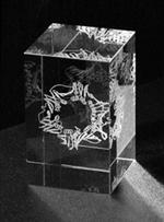 It has also recently become possible to create accurate molecular models inside glass blocks using a technique known as subsurface laser engraving. The image at right (Fig. 7) shows the 3D structure of an E. coli protein (DNA polymerase beta-subunit, PDB code 1MMI) etched inside a block of glass by British company Luminorum Ltd.