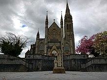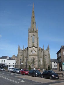 The Gothic-Revival St Macartan's Cathedral by J.J. McCarthy is recognised as being "one of McCarthy's best works: an excellent example of the High Victorian ecclesiastical style at its best, rich without ever being over-ornate".[15]:26 The building comprises a delicate rose window and an impressive soaring spire and took over thirty years to complete. Construction work began in 1861 and the cathedral was finally dedicated in 1892. Originally the nave was intended to be two bays longer but lack of funds meant that the design was cut back. The Cathedral sits on an imposing site overlooking the town. Occupying a similarly commanding site on the opposite side of the town is St Macartan's College for boys (from 1840), a 17-bay classical structure with a bell tower and private chapel, by the Newry-born architect Thomas Duff.