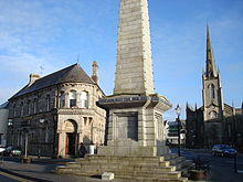 The Rossmore Memorial in The Diamond was built in 1876 as a memorial to The 4th Baron Rossmore, who died after a hunting accident at Windsor Castle in 1874. This Victorian monument, described by architectural historian C.E.B. Brett as "formidable and striking"[15]:10 is octagonal in shape, with central marble columns supporting a fountain. Around it, the eight grey columns support the pinnacled superstructure which rises to a dome. The dome is surmounted by a spire supported by yet more columns. The letters of Rossmore (also eight in number) are spaced out around the monument.