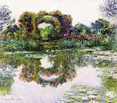 Monet purchased additional land with a water meadow. In 1893 he began a vast landscaping project which included lily ponds that would become the subjects of his best-known works. White water lilies local to France were planted along with imported cultivars from South America and Egypt, resulting in a range of colours including yellow, blue and white lilies that turned pink with age.[53] In 1899 he began painting the water lilies, first in vertical views with a Japanese bridge as a central feature, and later in the series of large-scale paintings that was to occupy him continuously for the next 20 years of his life.[54] This scenery, with its alternating light and mirror-like reflections, became an integral part of his work. By the mid-1910s Monet had achieved: