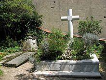 Monet died of lung cancer on 5 December 1926 at the age of 86 and is buried in the Giverny church cemetery.[49] Monet had insisted that the occasion be simple; thus only about fifty people attended the ceremony.[59] At his funeral, his long-time friend Georges Clemenceau removed the black cloth draped over the coffin, stating, "No black for Monet!" and replaced it with a flower-patterned cloth.[60] Monet did not leave a will and so his son Michel inherited his entire estate.