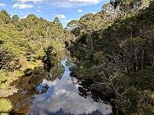 Downstream of the village, just below the junction with Feagan's Creek,[22] the river had cut a off a large oxbow, creating a landform still known today as the 'Half Moon', or 'Half Moon Flat'. While the Half Moon was still a part of the river, alluvial gold had accumulated there over thousands of years from the gold reefs around Mongalowe. The shortcut made by the river also created a landform known as 'Sydney Heads', which would become the site of a mining camp.[23] In the early 20th-century, Half Moon would be the location of dredge mining.