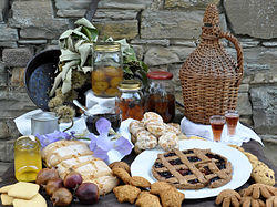 Monghidoro is also renowned for its cakes; these are traditionally made with either wheat or chestnut flour then usually filled with fruits of the wood, jams and preserves, in the crostata style as well as apples, pears, figs, prunes, wholenuts, hazelnuts and pinenuts.