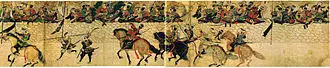 The battle lasted for only a day and the fighting, though fierce, was uncoordinated and brief.[22] One low-ranking samurai, Takezaki Suenaga, received word from his commander Shōni Kagesuke that he was to wait until the Mongols advanced due to difficult terrain, but Takezaki attacked the Mongols anyway. On his way to the beach, he encountered Kikuchi Takefusa, who had already encountered a Yuan detachment, driven them away and killed two. Kikuchi told him the 'pirates' had already fled. Takezaki and his five companions charged the small Yuan detachment that Kikuchi had previously encountered, but their horses got stuck in the mud, and they were wounded by a barrage of arrows. Takezaki and three surviving retainers managed to retreat with the aid of Shiroishi Michiyasu, who charged the Yuan detachment and drove them away.[23][24] By nightfall the Yuan invasion force had forced the Japanese off the beach with a third of the defending forces dead, driven them several kilometres inland, and burnt Hakata.[25]