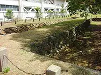After the invasion of 1274, the shogunate made efforts to defend against a second invasion, which they thought was sure to come. They better organized the samurai of Kyūshū and ordered the construction of forts and a large stone wall (石塁, Sekirui or 防塁, Bōrui) and other defensive structures at many potential landing points, including Hakata Bay, where a two-meter (6.6 ft) high wall was constructed in 1276.[31] In addition, a large number of stakes were driven into the mouth of the river and the expected landing sites to prevent the Mongol Army from landing.