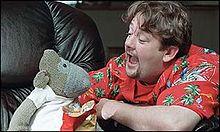 Monkey is sometimes portrayed as being quite cowardly; for example his refusal to take responsibility for dropping a ceramic bowl dating back to 3000 BC, despite being filmed doing so.[12] He is also prone to miserliness, having admitted that he re-uses discarded plasters he finds in swimming pools.[12] Monkey hoards both his and Al's wages, deliberately neglecting to inform the naive Al of the fact that they are in fact paid for their work, stating "I don't bother Al with details" and that his money is "safely invested in a portfolio of bananas".[13] Despite his turbulent relationship with Al, the two share the same bed.[14] Monkey is shown to be very passionate about tea, his favourite serving method being "three stirs clockwise, two stirs back, one and three quarters sugars".[15] He vehemently insists that tea bags should precede milk when brewing.[13] His exact species is never clarified; Monkey himself denies being a chimpanzee (the CHimp logo on his tea-shirt puns on CH sounding like the Chinese word for tea), and his response to Al's idea that he may be "half monkey-half chimp" is limited to "speak for yourself".[13] Though he claims to be a "ladies' monkey", he is caught by Al surfing dating sites, giving exaggerated descriptions of his physical appearance.[16] He is sometimes shown wearing a woman's nightcap,[14] a sheath dress[17] and a ballet tutu.[18] He gets distressed if tea is made in the wrong order.