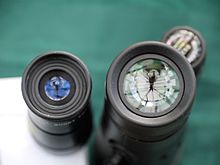 Eye relief is a particularly important (but often overlooked) parameter for spectacle wearers if the full field of view is to be visible. Although magnification, objective lens diameter and field of view (either in degrees or m @1000m) are often shown on the body of the monocular, eye relief virtually never is (except perhaps to say "long eye relief" or "LER"). Early optics tended to have short eye relief (sub-10mm) but more contemporary designs are now much better. At least 15mm is desirable—ideally nearer 20mm—for spectacle wearers. (See table of eye reliefs below, noting the best in class, Opticron 5×30 at 25mm and Opticron 8×42 DBA at 21mm). Eye relief can seriously compromise the field of view if too short, so even if an optic has a good field of view specification, without an accompanying long eye relief, the benefit of the wide view will not be obtained (again, only applying to spectacle wearers). Good eye relief can greatly be facilitated by the eye lens diameter. The photograph below shows a comparison between two 8× monoculars, the one on the left typical of a 1980s design and with a relatively small eyepiece lens diameter (11mm) and sub-10mm eye relief. The one on the right is more contemporary—from 2016—and with a relatively large eyepiece diameter (24mm) and approximately 15mm eye relief. This large eyepiece lens not only helps eye relief but also helps to create a wider field of view.