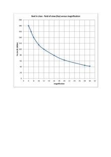 Field of view (fov) and magnification are related; for a given situation, fov increases with decreasing magnification and vice versa. This applies to monoculars, binoculars and telescopes. However, this relationship also depends on optical design and manufacture, which can cause some variation. The chart below has been compiled by the author to show the fov/magnification relationship based on best-in-class data, taken both from personal tests and from manufacturers' specifications. Contrary to some belief, it is a myth that binoculars offer a wider field of view than monoculars. For a given specification and manufacturer offering both monocular or binocular options of the same model, the field of view is exactly the same whether monocular or binocular.