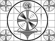 This signal reproduced an accurate still image of the target, so the monoscope was used to produce still images such as test patterns and station logo cards. For example, the classic Indian Head test card used by NBC, shown on the right was often produced using a monoscope.
