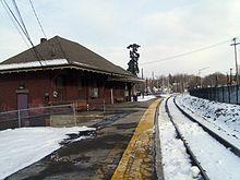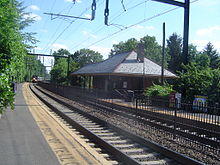 After Upper Montclair station the tracks turn northeast, crossing under Lorraine Avenue, and paralleling Valley Road. The line continues northward paralleling Upper Mountain Avenue through the Upper Montclair district. A short distance later, the tracks enter Mountain Avenue, the next to last station in Montclair. Mountain Avenue has two low platforms, and the nearby station building, which is rented by New Jersey Transit as a private residence.[44] The building was constructed in 1889 by the New York & Greenwood Lake as an irregular shape, similar to Benson Street station on the former Boonton Line alignment east of Montclair.[9] After Mountain Avenue the tracks continue northward through Upper Montclair, passing through Mountainside Park and crossing Mount Hebron Road.[41]