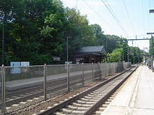 Near the intersection of Springdale Avenue and Ampere Parkway, trains pass through the site of the former Ampere Station. Ampere was built around 1909 and remained in use during New Jersey Transit days until April 7, 1991, when along with Grove Street, the station was closed.[15] From here, the lines continue into Bloomfield.[41]