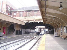 On April 1, 1868, the Morris & Essex Railroad bought out the alignment of the Newark and Bloomfield Railroad.[4] The Morris & Essex began running services on the line, which was renamed the "Montclair Branch" when West Bloomfield was similarly renamed to "Montclair" shortly after. The Delaware, Lackawanna and Western Railroad soon gained trackage rights, and by the turn of the 20th century, the railroad had begun constructing track depressions and raises to eliminate grade-level crossings on city streets.[5][6] In 1912, the Montclair Branch was depressed, elevated, and double tracked, and grade crossings were eliminated. The stations at Watsessing Avenue and Glen Ridge were constructed below street level, while Ampere and Bloomfield stations were constructed above street level. Roseville Avenue station was already depressed, 22 feet (6.7 m) below street level, in 1903.[6]