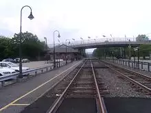 After paralleling Interstate 80 out of Mount Arlington station, the line heads southwestward until turning northeastward through the community of Landing. From there, the line goes northward along Morris County Route 631 heading into downtown Landing, where the tracks turn northeastward. The tracks soon enter the Lake Hopatcong station. Lake Hopatcong has two low platforms with a shelter on the westbound side. The original Delaware, Lackawanna and Western station was much larger, built in 1911 to replace the original Hopatcong stop. The original station had two large towers and two long concrete platforms to access from the original 1911 station on Landing Road.[50] A short distance later, the tracks cross under the Landing Masonry Bridge (which contains Landing Road/CR 631) and continue westward into Port Morris Junction. At Port Morris Junction, the Montclair-Boonton Line turns to the southwest, while the right-of-way continues westward along as the Lackawanna Cut-Off. The line also passes Port Morris Yard, where the shell of the former junction tower, built in 1909, stands.[50] Continuing to the southwest, the tracks parallel Lake Musconetcong and enter the community of Netcong. After crossing under New Jersey Route 183, the tracks enter downtown Netcong and into the Netcong station. Netcong has a brick house on its one low platform. The station building, built in 1903, used bricks from a location in nearby Port Murray. Netcong Station was also site of the junction to the former Sussex Branch built by the Delaware, Lackawanna and Western, discontinued from Branchville on July 13, 1966.[51][50]