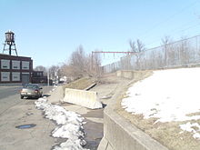 After Great Notch, the tracks continued southwestward through Little Falls, crossing under Long Hill Road (CR 631) and Francisco Road (CR 612) before making a curve back to the northwest at a siding on Cedar Grove Road. The tracks then go over a curved bridge over the Peckman River. The northwestern-bound tracks enter downtown Little Falls, paralleling New Jersey Route 23 into the namesake Little Falls station at Union Boulevard (CR 646).[41] Little Falls is a one low platform station, with the original building, constructed in 1915, standing on the single platform.[9] The station has a 194-spot parking lot and the brick building is used as a waiting room. After the station, the tracks continue northwestward, approaching the Passaic River once again at the community of Singac. The community of Singac is the former site of the namesake Singac Station, which has been out of service for quite a while.[47] After the Passaic, the tracks enter the town of Wayne.[41]