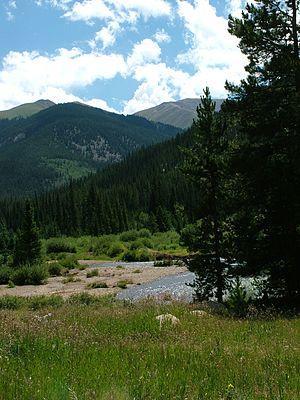 The Town of Montezuma is a statutory town located in eastern Summit County, Colorado, United States. The town population was 65 at 2010 United States Census.[7] The town is a former mining camp that sits at an elevation of 10,200 feet (3,110 m), just west of the Continental Divide, nestled among mountains that reach an elevation of 12,000-13,000 feet (3,700-4,000 m) around it. It is situated in the upper valley of the Snake River above the ski resort of Keystone in the Rocky Mountains.