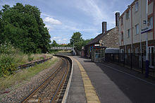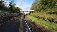 Montpelier railway station is located in the Bristol ward of Ashley, north of the city centre, serving the districts of Montpelier, Cotham, Ashley Down and St Andrews. The surrounding area is mostly residential, with shops on the nearby A38 Cheltenham Road.[1] The station can be accessed step-free from Station Road to the south, or by a footbridge and steps from Cromwell Road to the north.[2] The station is on the Severn Beach Line from Bristol Temple Meads to Severn Beach, 2 miles 68 chains (4.6 km)[note 1] from Bristol Temple Meads, and 10 miles 55 chains (17.2 km) from Severn Beach.[3][4][5] It is the third station from Temple Meads, and first station of the branch part of the line (the first two stations, Lawrence Hill and Stapleton Road, are on the main line Cross Country Route).[6] The station is on a roughly east–west alignment, curving to the north, with a single 144-yard-long (132 m) curved platform to the south of the track, serving trains in both directions. Directly to the east of the station is the 268-yard-long (245 m) Montpelier Tunnel, and to the west is The Arches bridge over the A38.[7] The station's northern platform was abandoned in 1970 and is overgrown.[8]