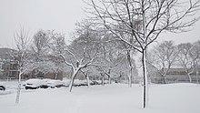 Winter brings cold, snowy, windy, and, at times, icy weather, with a daily average ranging from −10.5 to −9 °C (13.1 to 15.8 °F) in January. However, some winter days rise above freezing, allowing for rain on an average of 4 days in January and February each. Usually, snow covering some or all bare ground lasts on average from the first or second week of December until the last week of March.[79] While the air temperature does not fall below −30 °C (−22 °F) every year,[80] the wind chill often makes the temperature feel this low to exposed skin.