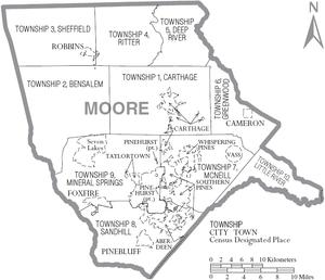Moore County is a county located in the U.S. state of North Carolina. As of the 2010 census, the population was 88,247.[1] Its county seat is Carthage[2] and its largest town is Pinehurst. It is a border county between the Piedmont and the Atlantic Coastal Plain.