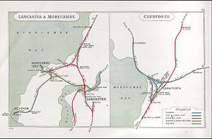 The first proposals for a branch from Morecambe to the Lancaster and Carlisle Railway (L&C) at Hest Bank were put forward by the Morecambe Harbour and Railway Company (a constituent company of the NWR) in 1846[2] but these were soon dropped on cost grounds. The L&C revived the scheme in 1858,[3] with the intention of using the NWR's harbour facilities (suitably expanded) to export coke & iron ore from the North East, brought in via the South Durham & Lancashire Union Railway and the L&C main line. The NWR opposed the plans as it would lose its monopoly on traffic into the town, but its shaky finances eventually led it to reach an agreement with the L&C that would allow the latter to build its line but not require the associated harbour improvements to be carried out. The three-mile branch, including a link to the NWR station at Northumberland Street, was opened in August 1864. The hoped-for mineral traffic did not materialise and the route remained a modest branch, although the LNWR did have to provide its own station at Poulton Lane from November 1870 because of increasing congestion at Northumberland Street. This was replaced by a rather more substantial terminus at nearby Euston Road in 1886[4] as part of an improvement scheme that also saw the construction of a west-to-south curve from Bare Lane to join the WCML at Morecambe South Junction (opened in 1888), which permitted through running to Lancaster Castle without the need for a reversal, and hence gave access for longer-distance trains to places such as Manchester, Liverpool and London. The branch was also doubled (apart from the Hest Bank to Bare Lane curve) and a regular local service introduced between Euston Road and Lancaster Castle to complement that to/from Hest Bank. Despite these improvements and a journey time similar to the older route, the Midland line continued to carry most of the traffic to and from the town, especially after it was electrified in 1908 (see below).