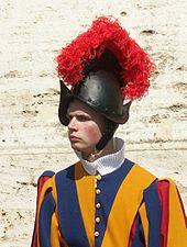 - The comb morion (with a red crest added) is part of the uniform of the Pope's Swiss Guards.[32] A Swiss guardsman in his morion appears on the Vatican City commemorative two-Euro coin.