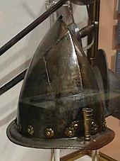 A similar helmet, the cabasset (Spanish: capacete) was also worn during the 16th century and also originated in Spain, but it is unclear if it predated the morion or was an adaptation of it, with some sources saying it was a more modern helmet.[18][19][20][21] The word is likely to derive from the Spanish word "cabeza" (head),[22][23][24][25] although some sources point towards the word "pear" in an Italian dialect, making reference to the stalk-like projection of the helmet, which resembles the fruit.[26][27] They were produced mainly in Calatayud, a town in Aragon. Like morions, it was worn by infantry in the pike and shot formations.[28] It was popular in 16th-century England and was used during the Civil War. Several of these helmets were taken to the New World by the Pilgrim fathers, and one of these has been found on Jamestown Island.[29]