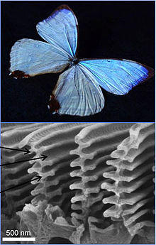 - ^ Siddique, R. H.; Diewald, S.; Leuthold, J.; Hölscher, H. (2013). "Theoretical and experimental analysis of the structural pattern responsible for the iridescence of Morpho butterflies". Optics Express. 21 (12): 14351–14361. doi:10.1364/OE.21.014351. PMID 23787623.