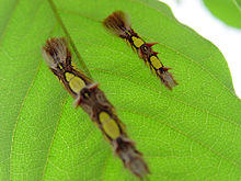The larvae hatch from pale-green, dewdrop-like eggs. The caterpillars have reddish-brown bodies with bright lime-green or yellow patches on their backs. Its hairs are irritating to human skin, and when disturbed it secretes a fluid that smells like rancid butter from eversible glands on the thorax. The strong odor is a defense against predators. They feed on a variety of plants. The caterpillar molts five times before entering the pupal stage. The bulbous chrysalis is pale green or jade green and emits a repulsive, ultrasonic sound when touched.[15] It is suspended from a stem or leaf of the food plant.[16]
