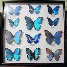 The morpho butterflies comprise many species of Neotropical butterfly under the genus Morpho. This genus includes more than 29 accepted species and 147 accepted subspecies, found mostly in South America, Mexico, and Central America.[1] Morpho wingspans range from 7.5 cm (3.0 in) for M. rhodopteron to 20 cm (7.9 in) for M. hecuba, the imposing sunset morpho. The name morpho, meaning "changed" or "modified", is also an epithet.