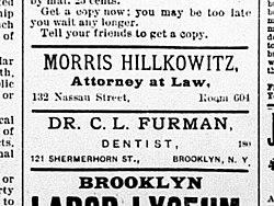 Within a year or so of joining the SLP, biographer Pratt notes, Moishe became one of the party's leading crusaders against anarchism, publishing a lengthy article "Sotzializm un anarchizm" in the Arbeter Zeitung [Workers' News], a Yiddish newspaper that he helped to establish. Hillkowitz contrasted the individualism of anarchism with the communalism of socialism in the piece.[9] During that time the 19-year-old Hillkowitz worked as the business manager of the Arbeter zeitung, a paper that was jointly founded with Abraham Cahan, Louis Miller, and Morris Winchevsky in an effort to reach the city's Yiddish-speaking immigrant working class about socialism in their own idiom.[10] Hillkowitz, ironically, was not fluent in Yiddish, having been raised with the German and Russian languages.[11]