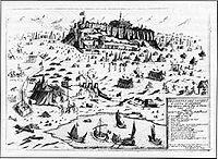 Early mortars, such as the Pumhart von Steyr, were also large and heavy, and could not be easily transported. Simply made, these weapons were no more than iron bowls reminiscent of the kitchen and apothecary mortars whence they drew their name. An early transportable mortar was invented by Baron Menno van Coehoorn (Siege of Grave, 1673).[8] This mortar fired an exploding shell, which had a fuse lit by the hot gases when fired. This innovation was quickly taken up, necessitating a new form of naval ship, the bomb vessel. Mortars played a significant role in the Venetian conquest of Morea and in the course of this campaign an ammunition depot in the Parthenon was blown up (see engraving).