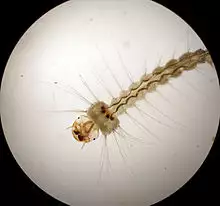 The mosquito larva has a well-developed head with mouth brushes used for feeding, a large thorax with no legs, and a segmented abdomen.