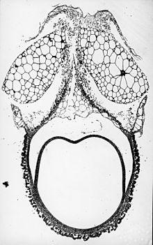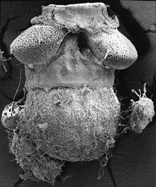 Azolla has microscopic male and female gametophytes that develop inside the male and female spores. The female gametophyte protrudes from the megaspore and bears a small number of archegonia, each containing a single egg. The microspore forms a male gametophyte with a single antheridium which produces eight swimming sperm.[21] The barbed glochidia on the male spore clusters cause them to cling to the female megaspores, thus facilitating fertilization.