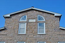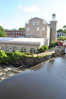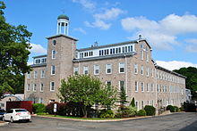 The second mill began producing nails in 1814, and five years later its owner, Ruggles Whiting of Boston, sold it to the owner of the first mill, George Bird, who began using the whole site to manufacture paper.[59] In 1823 it switched to cotton, using the machinery of the former Norfolk Cotton Company. In 1835 a new stone mill was erected.[69] It stands today, and was converted into a condominium complex in 1986–87.[6] Unlike the other mills, which were constructed in a strictly utilitarian style, this factory boasted a date stone reading "1835" and a dome-roofed cupola over the mill bell.[62] Together they stood as a testament to the primacy of the mills in the neighborhood.[62][63]
