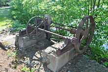 Eventually, dams and mills were constructed at five locations called "privileges" in Dedham and in what is now the Readville section of Hyde Park, which was originally part of Dedham.[6] Mother Brook provided water power at various times for industrial mills of several types, for the manufacture of cotton, wool, paper, wire, and carpets. They also produced corn, fulled cloth, stamped coins, sawed lumber, cut and headed nails, manufactured paper, wove cloth, and leather.[35] There were mills operating on Mother Brook until some time in the 20th century. At least one mill located on Mother Brook was equipped with a steam engine as an energy source, probably to supplement the water power when the water supply was insufficient but possibly to supplant the water power entirely. The brook may also have served for cooling the steam machinery.