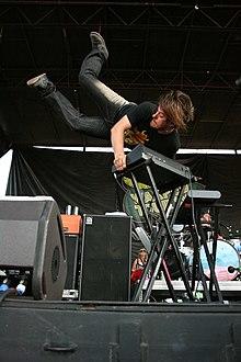 The band's musical style is widely recognizable by its unique blend of pop punk with the Moog synthesizer. The usage of the Moog stems from Cain, who first heard the instrument employed on the Rentals' album Return of the Rentals (1995). He subsequently bought a cheap Moog at a pawn shop and wanted it to be an integral part of Motion City upon their formation.[8] Johnson became known for his signature "Moogstand" in live performances, which consisted of a handstand on the instrument.[8] The group has been widely attributed to a number of different genres, including pop rock,[33] power pop,[1] indie rock,[85] emo,[71] and pop punk.[1] Joshua Cain dismissed this latter label, remarking, "I definitely wouldn't consider us a pop-punk band. Our influences are more based on '90s bands like Superchunk and early Weezer."[86] Pierre characterized the band's music as "dirty, fast, happy, emotional rock songs."[33]